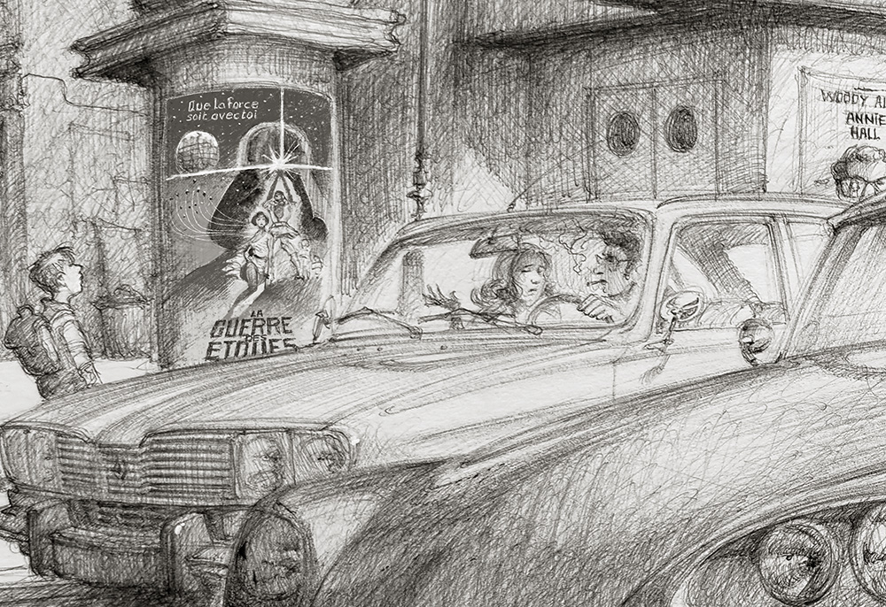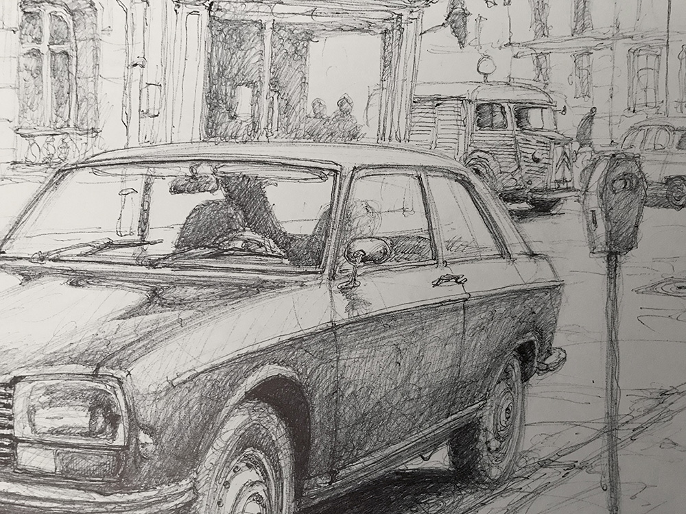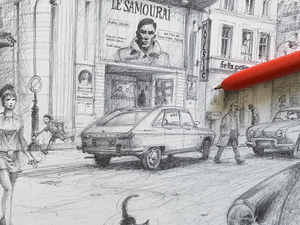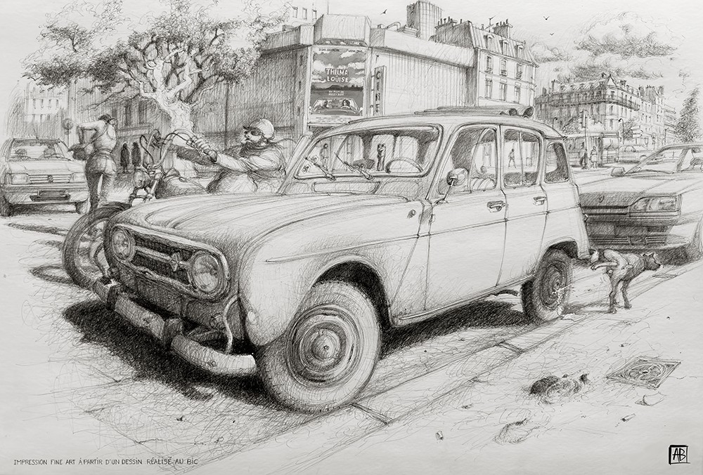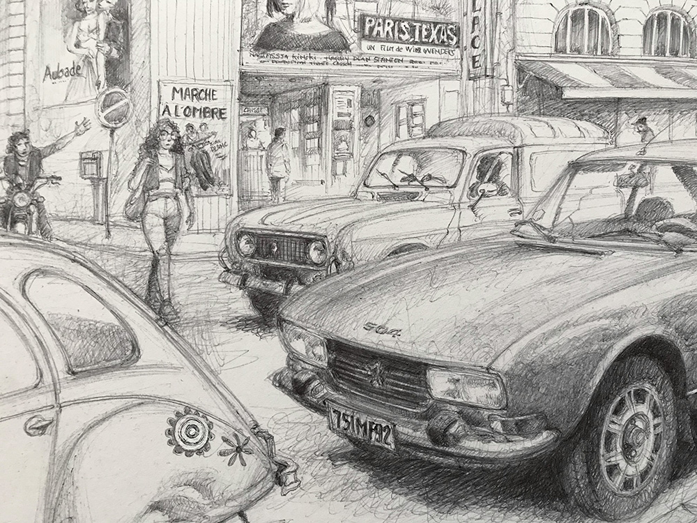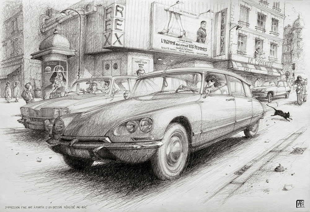 AUTOMOBIC est une série de dessins d’automobiles réalisés directement au stylo Bic. Des voitures passent ou stationnent devant des cinémas de quartier dans des rues foisonnantes issues de mon imaginaire ou de souvenirs. Et si il y a de la nostalgie dans ces dessins, je ne saurais affirmer que c’était mieux avant. J’aime avoir le pouvoir de voyager dans le temps avec un simple stylo Bic et rendre visite à mon enfance.